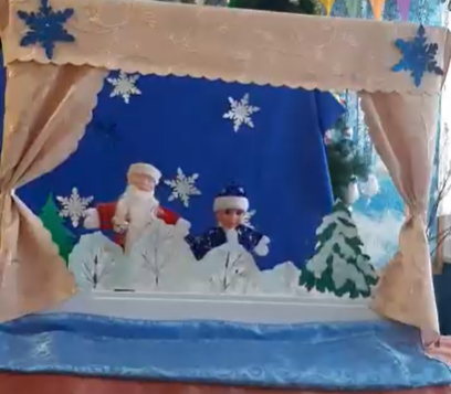Члены кружка "Кукольный театр"(руководитель Алексеева Т.М. показали для учащихся новогоднюю сказку "Колобок"